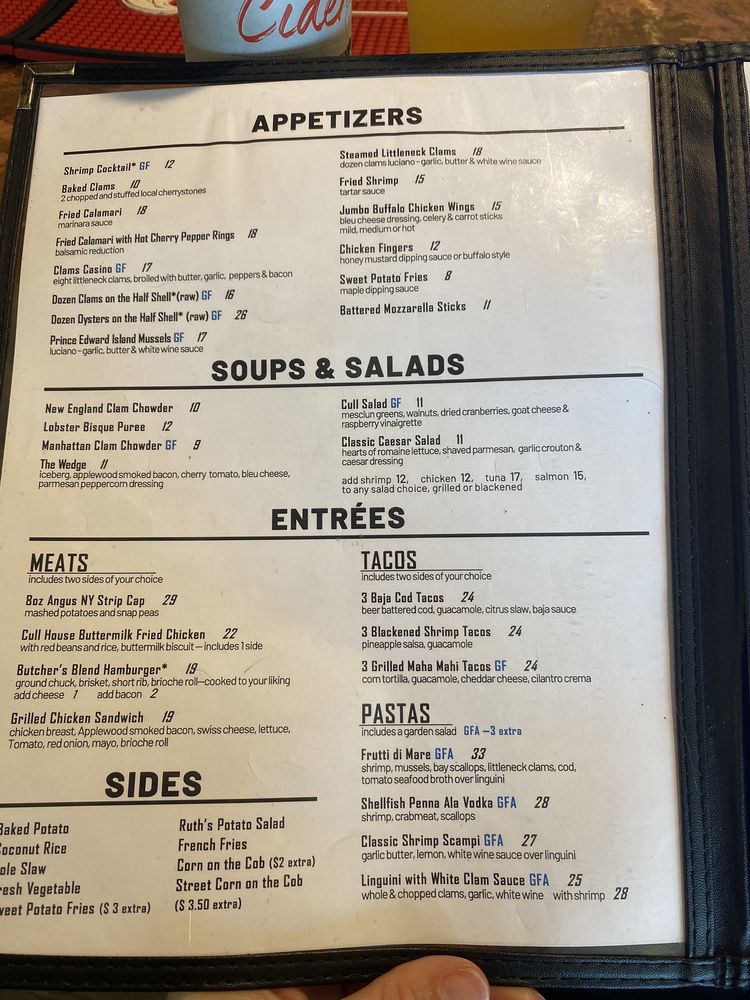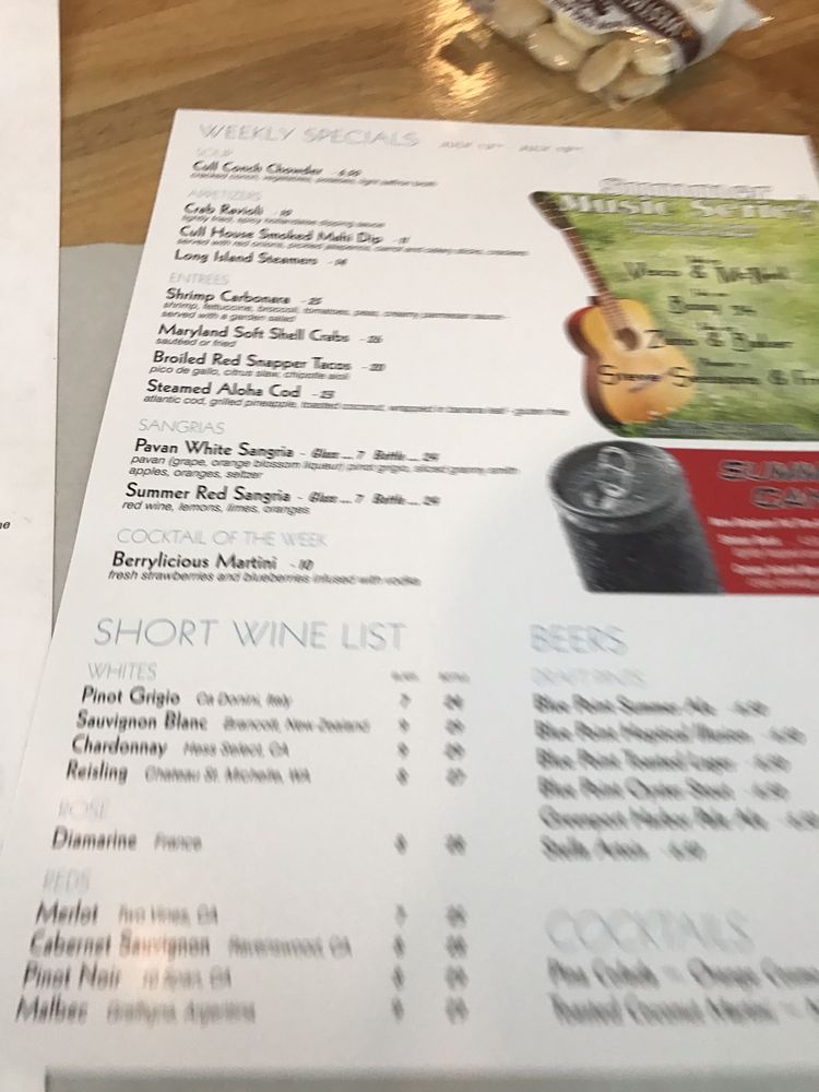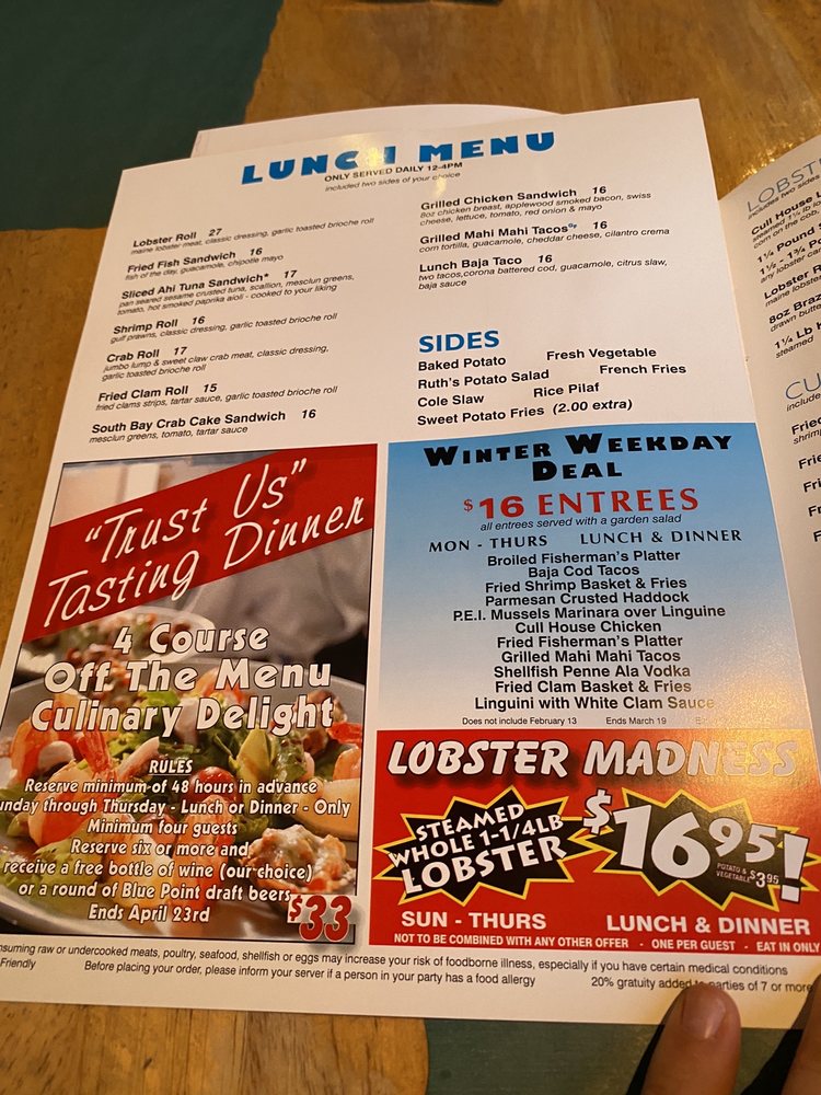 Introducing The Cull House, a seafood and beer bar located in Sayville, NY, with a cozy harbor ambiance. Their menu features a variety of appetizers, soups, salads, and specials like the Flounder Francaise. Customers praise their lobster rolls, lobster bisque, and broiled captains platter. However, some reviews mentioned smaller side portions and cheaper utensils. The outdoor seating offers a picturesque view of boat docks. Standout dishes include the 1/2 Dozen Oysters, Fried Calamari, and Lobster Bisque Puree. Overall, The Cull House is recommended for its delicious seafood, friendly service, and laid-back atmosphere. Don't miss their happy hour specials and live music events. A must-visit for seafood lovers in the area.
